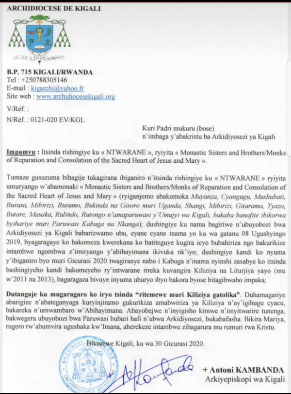 Iyo baruwa ivuga ko Ubuyobozi bwa Kiliziya Gatolika mu Rwanda bwagiranye ibiganiro n’iryo tsinda rishingiye ku Ntwarane ryiyita Umuryango w’Abamonaki, ariko abarigize bakanga kuva ku izima.
