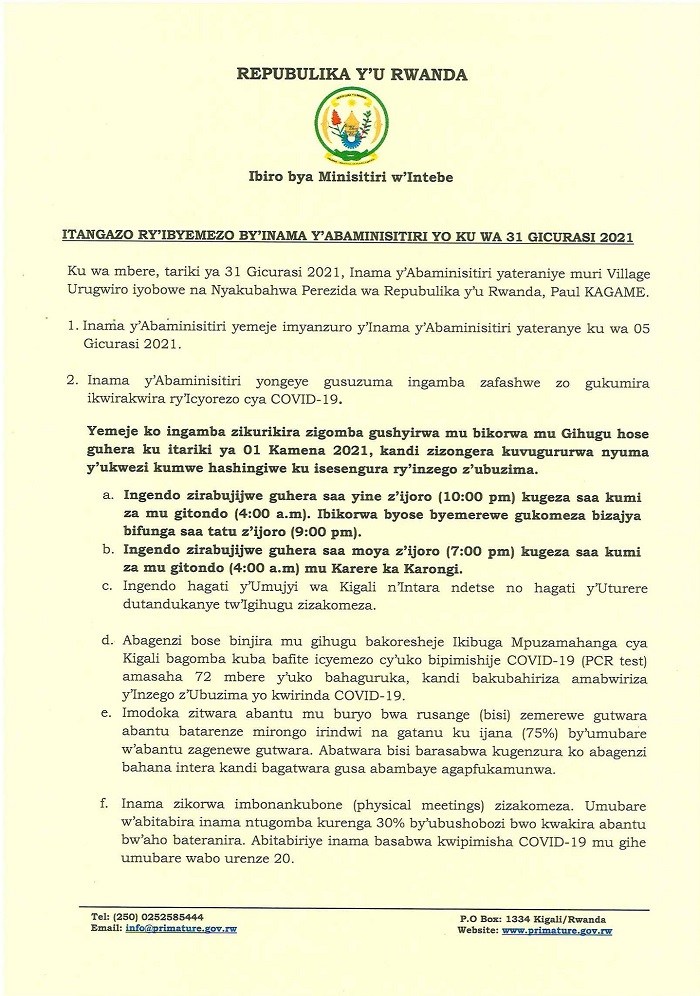 Perezida wa Repubulika Paul Kagame, ku mugoroba wo ku wa Mbere tariki 31 Gicurasi 2021 yayoboye Inama y’Abaminirisitiri, ibera muri Village Urugwiro, ikaba yafatiwemo ibyemezo bikurikira: