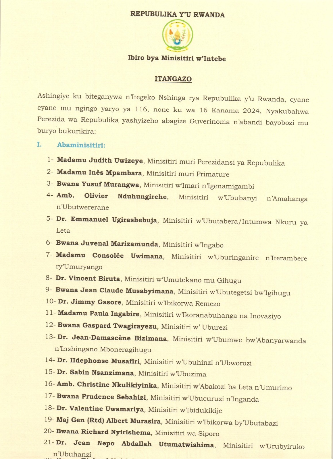 Itangazo rigaragaza urutonde rw’Abagize Guverinoma Nshya: