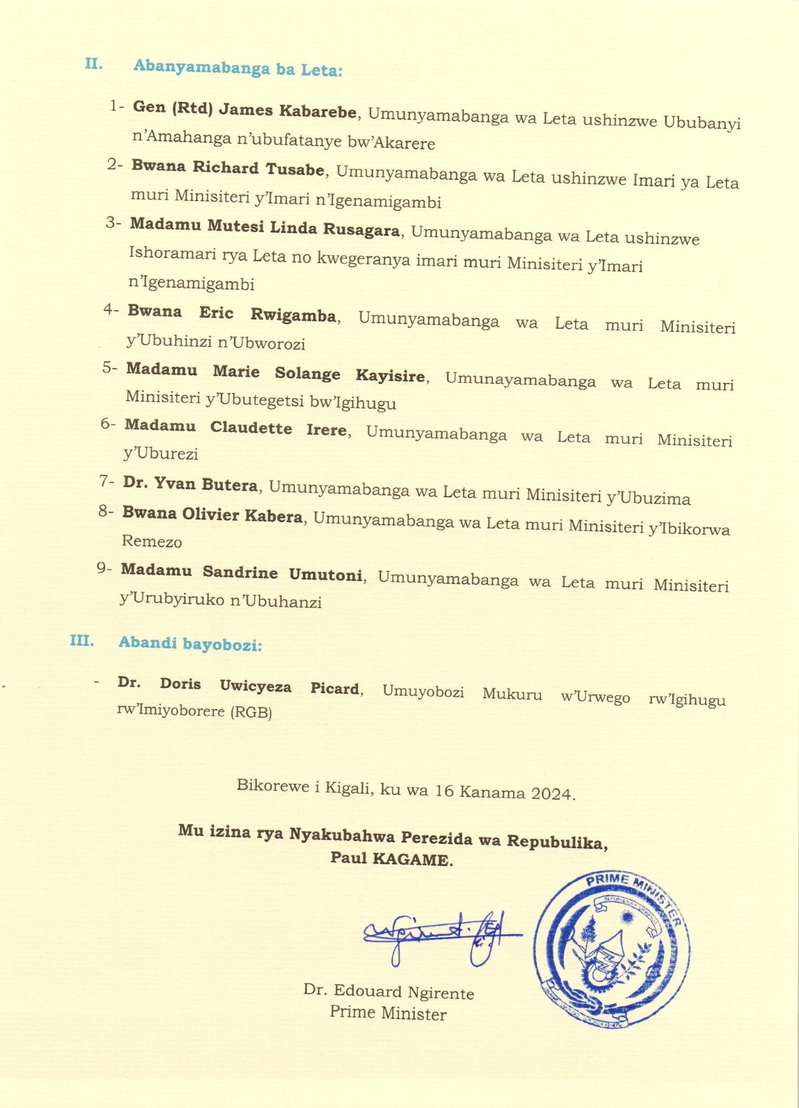Perezida wa Repubulika, Paul Kagame, yashyizeho abagize Guverinoma n’abandi bayobozi, itangazo riturutse mu Biro bya Minisitiri w’Intebe rikaba rigaragaza ko abayobozi Umukuru w"igihugu yashyizeho ari Abaminisitiri 21, Abanyamabanga ba Leta 9 n’Umuyobozi Mukuru w’Urwego rw’Igihugu rw’Imiyoborere (RGB).