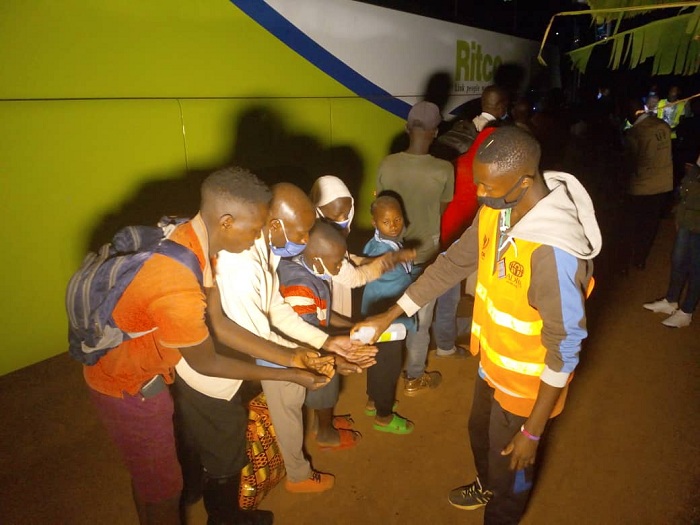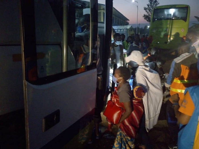Abatashye bashyizwe mu ma bisi manini ya RITCO bakaba bicaye mu biryo bahana intera hirindwa Covid-19. Mbere yo kwinjira mu modoka babanzaga gukaraba intoki hifashishijwe umuti wabugenewe mu rwego rwo kwirinda icyo cyorezo, bahawe kandi ibyo kurya n’amazi yo kunywa bibafasha muri urwo rugendo.