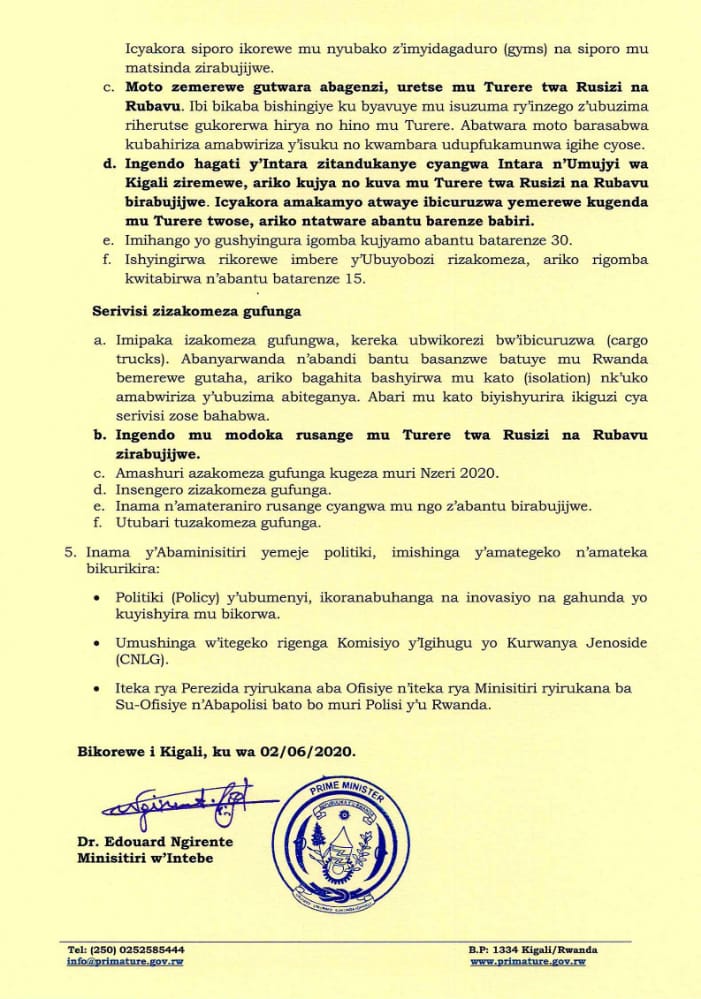 Iri tangazo ryo ku wa Kabiri tariki 02/06/2020 ryashyizweho umukono na Minisitiri w’Intebe, Dr. Edouard Ngirente.