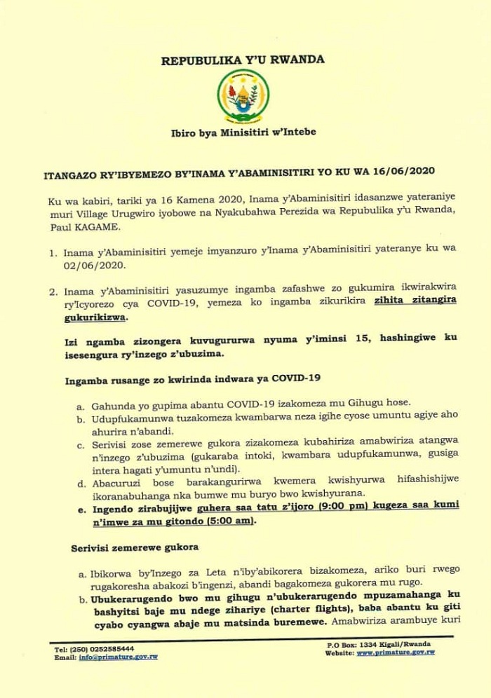 a. Imipaka izakomeza gufungwa, uretse ubwikorezi bw’ibicuruzwa (cargo trucks). Abanyarwanda n’abandi bantu basanzwe batuye mu Rwanda bemerewe gutaha, ariko bagahita bashyirwa mu kato (isolation) nk’uko amabwiriza y’inzego z’ubuzima abiteganya. Abari mu kato biyishyurira ikiguzi cya serivisi zose bahabwa.