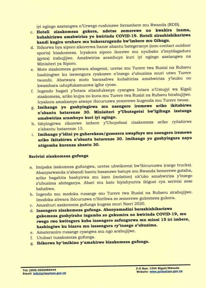 d. Ibikorwa bya siporo zikorerwa hanze abantu bategeranye (non-contact outdoor sports) bizakomeza. Icyakora siporo ikorewe mu nyubako z’imyidagaduro (gyms) irabujijwe. Amabwiriza arambuye kuri iyi ngingo azatangwa na Minisiteri ya Siporo.