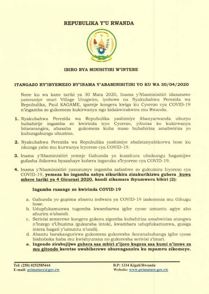 Ingamba zisanzweho zizakomeza kubahirizwa kugeza ku wa mbere tariki ya 04 Gicurasi 2020 igihe ingamba nshya zizaba zitangiye gushyirwa mu bikorwa.