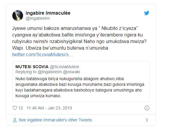 Umwaka ushize wa 2019 muri Mutarama ubwo irushanwa rya Miss Rwanda ryarimo rishaka uzambara ikamba [ubu ryambawe na Nimwiza Meghan], Ingabire Marie Imaculée ukurikirwa na benshi kuri Twitter, yanditse ku rukuta rwe ati “Nagerageje kumva akamaro ka Miss ariko wapi narakabuze. Sinzi icyo imariye Abanyarwanda dore ko n’abayizi ari bake cyane. N’ababaye ba Miss kugeza ubu simbona akarusho bazanye mu iterambere ry’igihugu. Pfffff”.