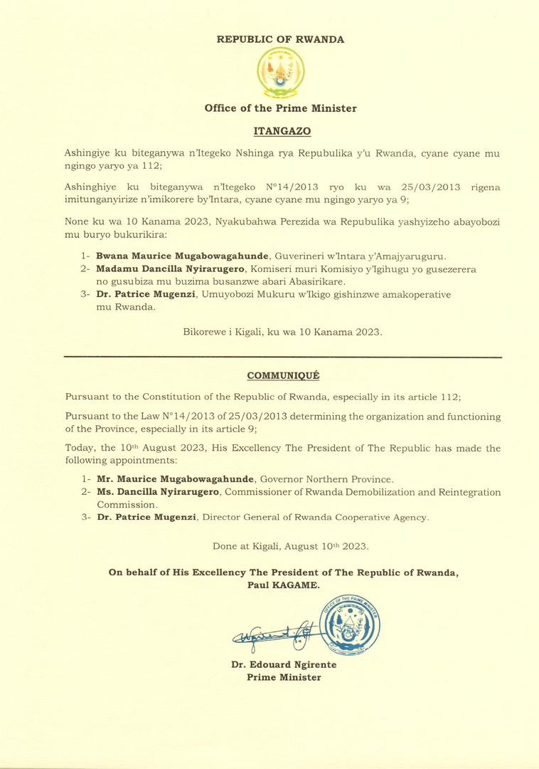 Itangazo riturutse mu biro bya Minisitiri w’intebe kuri uyu wa kane tariki 10 Kamena 2023 ryashyizeho Guverineri mushya w’intara y’Amajyaruguru Maurice Mugabowagahunde kuba Guverineri w’intara y’Amajyaruguru naho Nyirarugero Dancille wari Guverineri w’intara y’Amajyaruguru agirwa agirwa Komiseri muri Komisiyo y’igihugu yo gusezerera no gusubiza mu buzima busanzwe abari abasirikare.