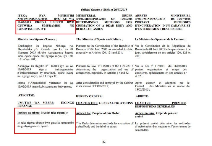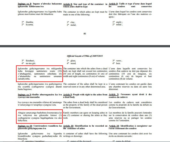 Mu kwezi kwa Nyakanga 2015 u Rwanda rwemeje itegeko ryemerera ababishaka kujya bashyingura abantu babo batwitswe, ivu rivuye mu mirambo yabo rikaba ryabikwa ahabugenewe.
