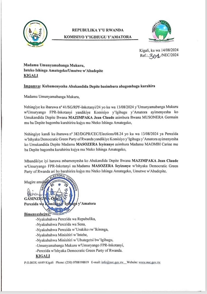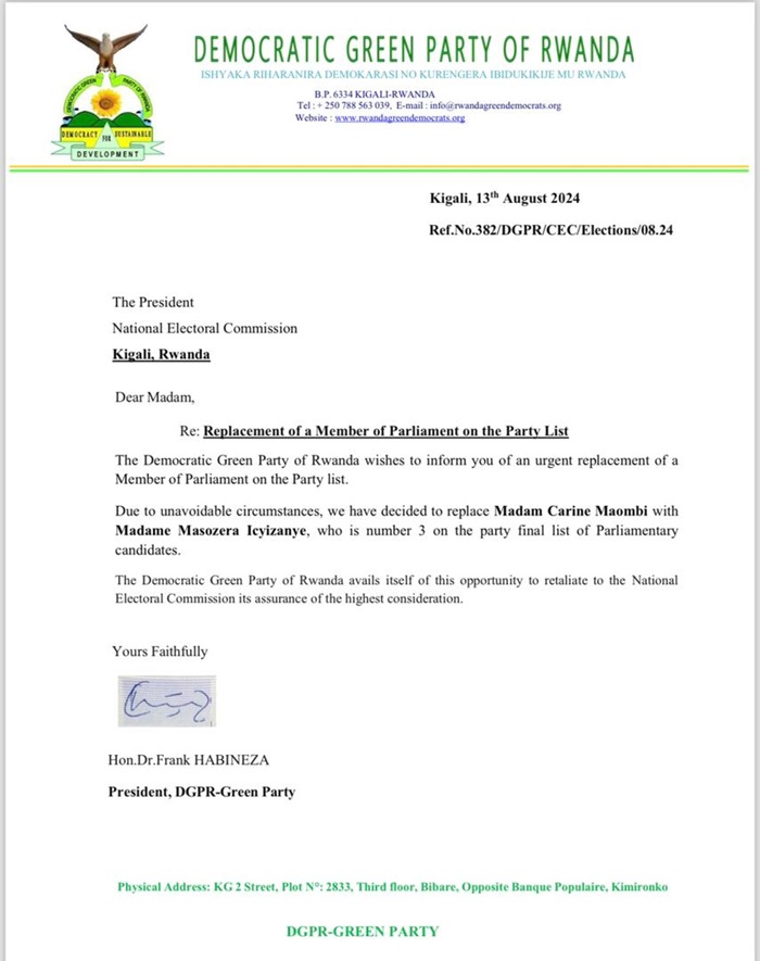 Mu itangazo umuyobozi w’ishyaka Green Party Dr Frank Habineza, yashyize ahagaragara kuri uyu wa gatatu, yamenyesheje Komisiyo y’Igihugu y’Amatora ko bafashe icyemezo cyo guhinduranya abadepite, bigatuma Maombi Carine wari ku rutonde rw’abagomba kurahira akurwaho agasimburwa na Masozera Icyizanye wamukurikiraga ku rutonde rwemejwe na NEC.