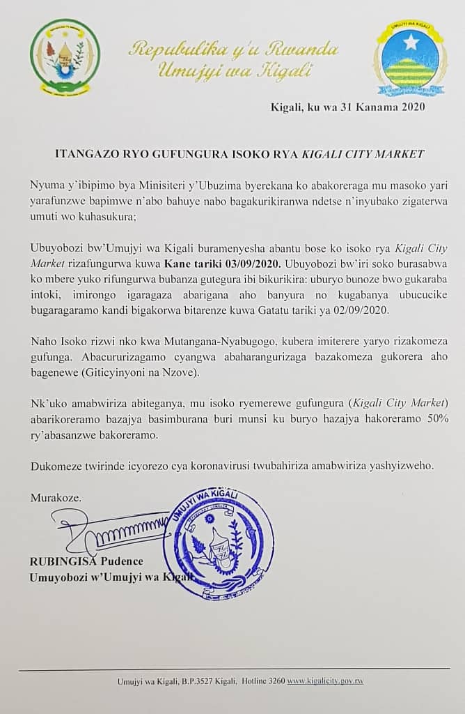 Ubuyobozi bw’Umujyi wa Kigali bwatangaje ko isoko riherereye rwagati mu Mujyi rizwi nka Kigali City Market rizafungurwa ku wa Kane tariki 03 Nzeri 2020. Ni mu gihe isoko rizwi nko kwa Mutangana-Nyabugogo rizakomeza gufunga.