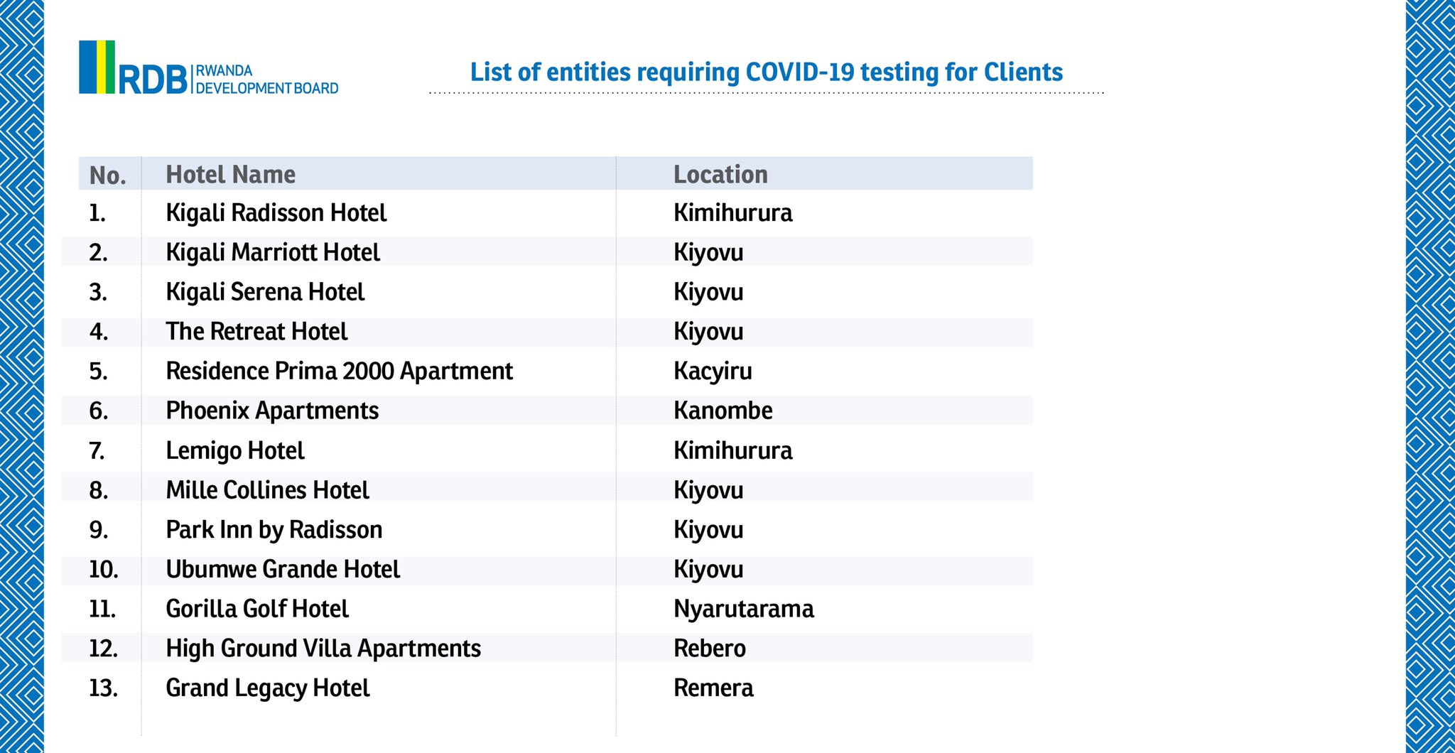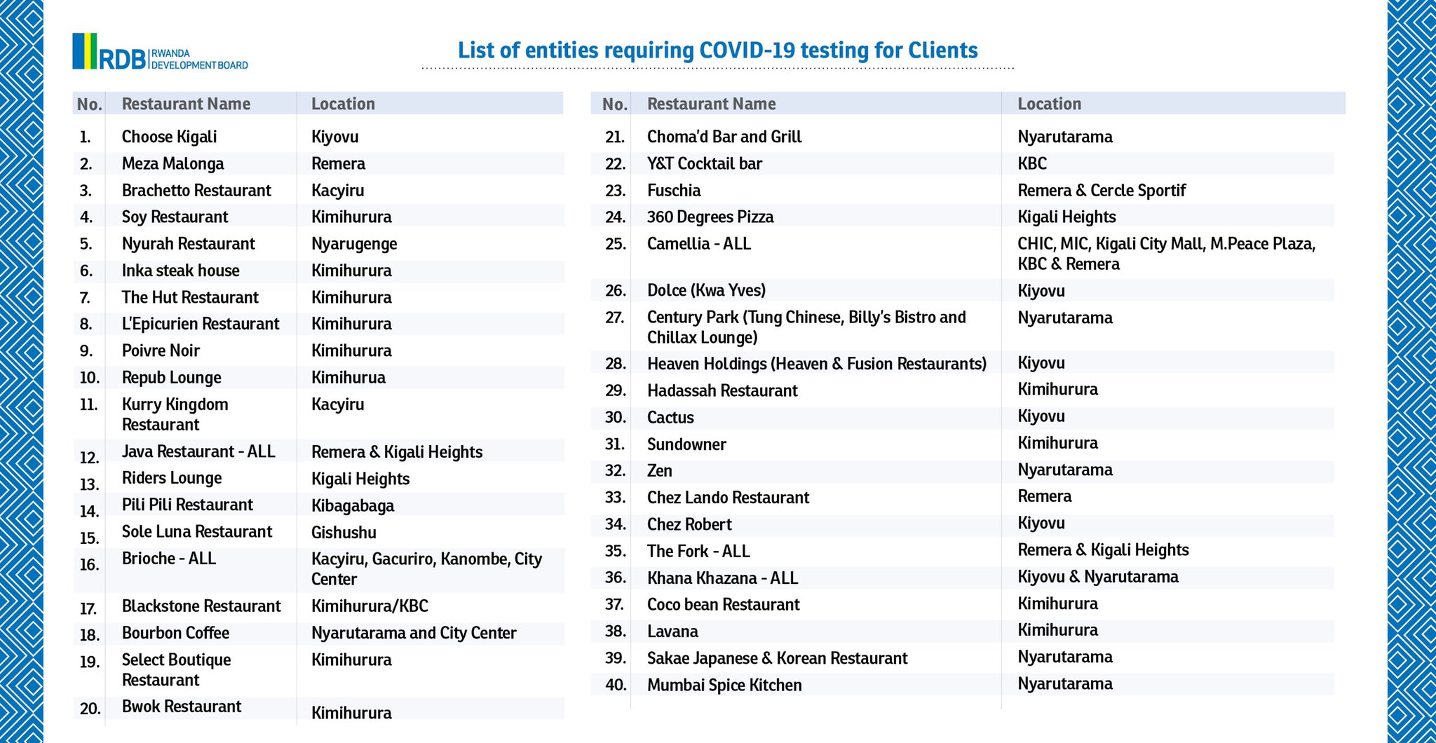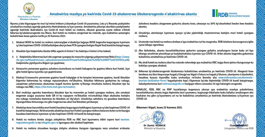 Urwego rw’Igihugu rw’Iterambere (RDB) rwasohoye urutonde rwa Hoteli 13 na Resitora 40 zo muri Kigali zashyiriweho amabwiriza yihariye ajyanye no kwakira abantu muri iki gihe cyo guhangana n’ikwirakwira rya COVID19. Amwe muri ayo mabwiriza avuga ko izo Hoteli na Resitora zizajya zakira abazigana ari uko babanje kwerekana ko bipimishije icyorezo cya COVID-19 ndetse n’abakozi bazo bakaba bategetswe kuzajya bipimisha, icyemezo cy’uko bipimishije kikagaragaza ko nta COVID-19 bafite.