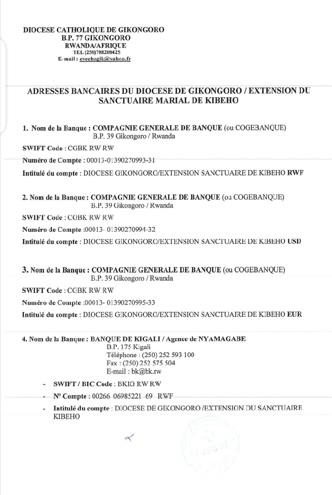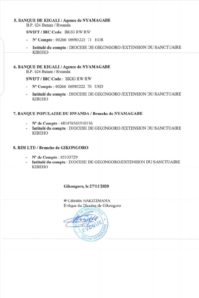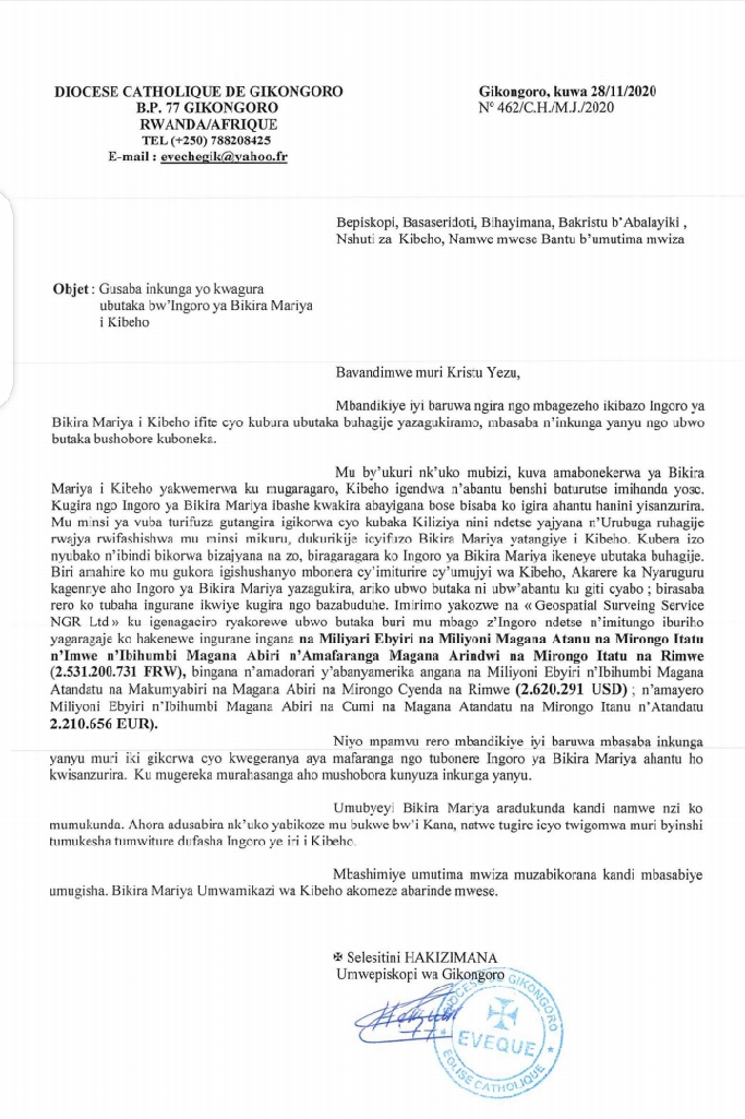 Umushumba wa Diyosezi ya Gikongoro, Musenyeri Célestin Hakizimana, yandikiye ibaruwa Abepisikopi, Abasaseridoti, Abihayimana, Abakirisitu b’abalayiki, inshuti za Kibeho n’abandi bantu bose b’umutima mwiza, abasaba inkunga yo kwagura ubutaka bw’Ingoro ya Bikira Mariya i Kibeho.