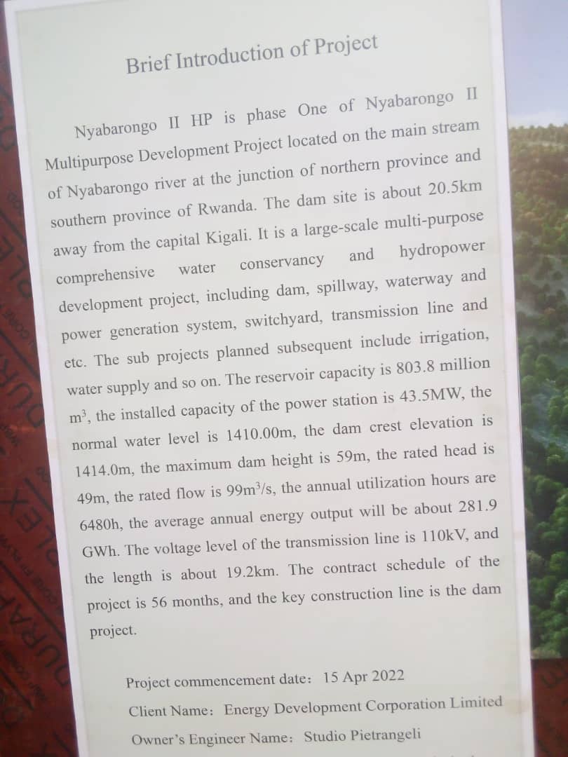 WANG Jiaxin, Umujyanama mu byerekeranye n’ubucuruzi muri Ambasade y’u Bushinwa mu Rwanda, yavuze ko kubaka uru rugomero rwa Nyabarongo II ari wo mushinga munini ushyigikiwe n’u Bushinwa mu Rwanda, haba mu bijyanye no gutanga inguzanyo izakoreshwa mu kurwubaka, ndetse na kompanyi izarwubaka ikaba ari iyo mu Bushinwa.