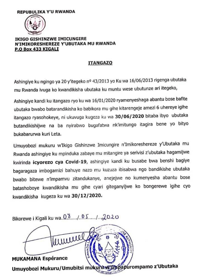 Mu itangazo iki kigo cyatanze, cyavuze ko hashingiwe ku mpinduka zabaye mu mitangire ya serivisi z’ubutaka hagamijwe kwirinda icyorezo cya COVID-19, hari abaturage batabashije kwandikisha ubutaka bwabo mu gihe cyari cyatanzwe.