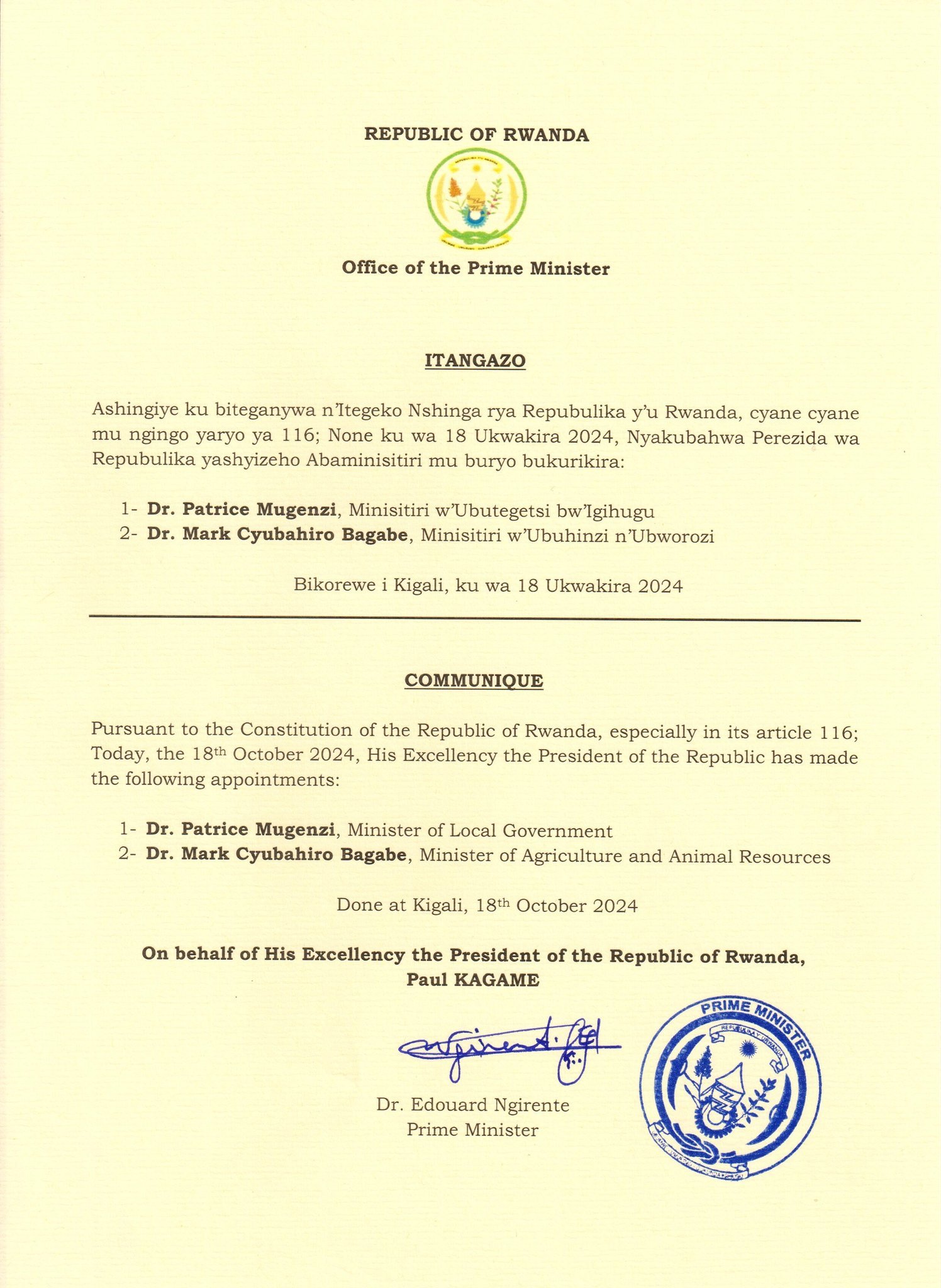 Dr Patrice Mugenzi wagizwe Minisitiri w’Ubutegetsi bw’Igihugu, yari Umuyobozi Mukuru w’Ikigo cy’Igihugu Gishinzwe Guteza Imbere Amakoperative (RCA). Asimbuye Musabyimana Jean Claude wari umaze hafi imyaka ibiri kuri uyu mwanya, yari yaragiyeho tariki 10 Ugushyingo 2022, asimbuye Gatabazi Jean Marie Vianney.