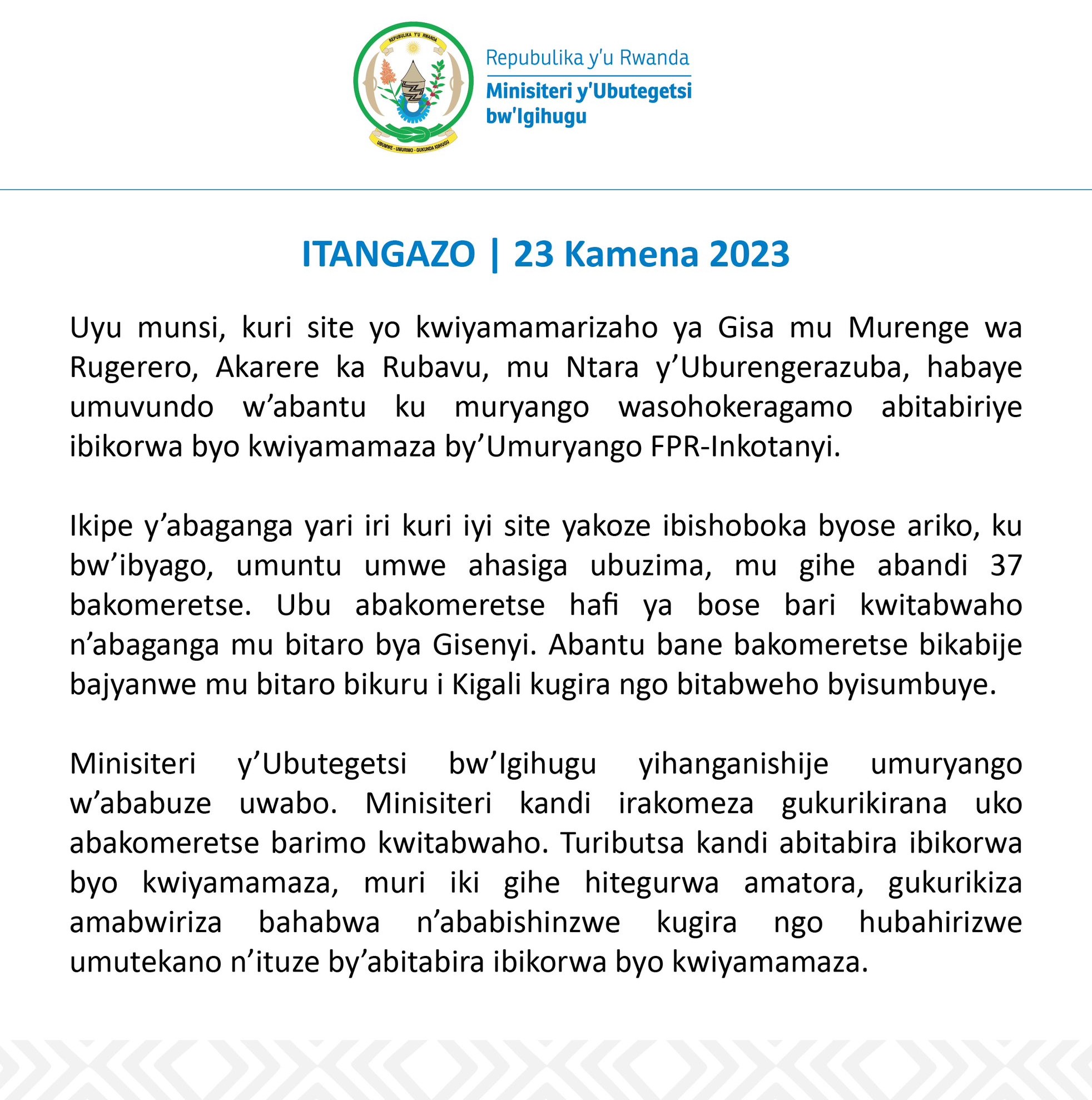 Ubu butumwa bwa MINALOC bukomeza bubivuga ko ikpe y’abaganga yari iri kuri iyi site yakoze ibishoboka byose ariko, ku bw’ibyago, umuntu umwe ahasiga ubuzima, mu gihe abandi 37 bakomeretse