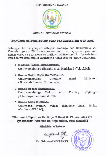 Harimo kandi Nibishaka Robert wagizwe umunyamabanga Mukuru muri Komisiyo y’Igihugu y’Uburenganzira bwa Muntu, hakabamo na Aime Muzora, wagizwe Umuyobozi mukuru w’ikigo cy’Igihugu gishinzwe amazi isuku n’isukura (WASAC).