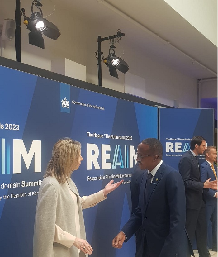 Aba bayobozi bombi bahuye ku ruhande rw’inama y’ikoranabuhanga n’ubwenge bw’ubukorano mu rwego rwa gisirikare (REAIM) yateraniye i La Haye, mu Bwami bw’u Buholandi ku ya 15-16 Gashyantare 2023.