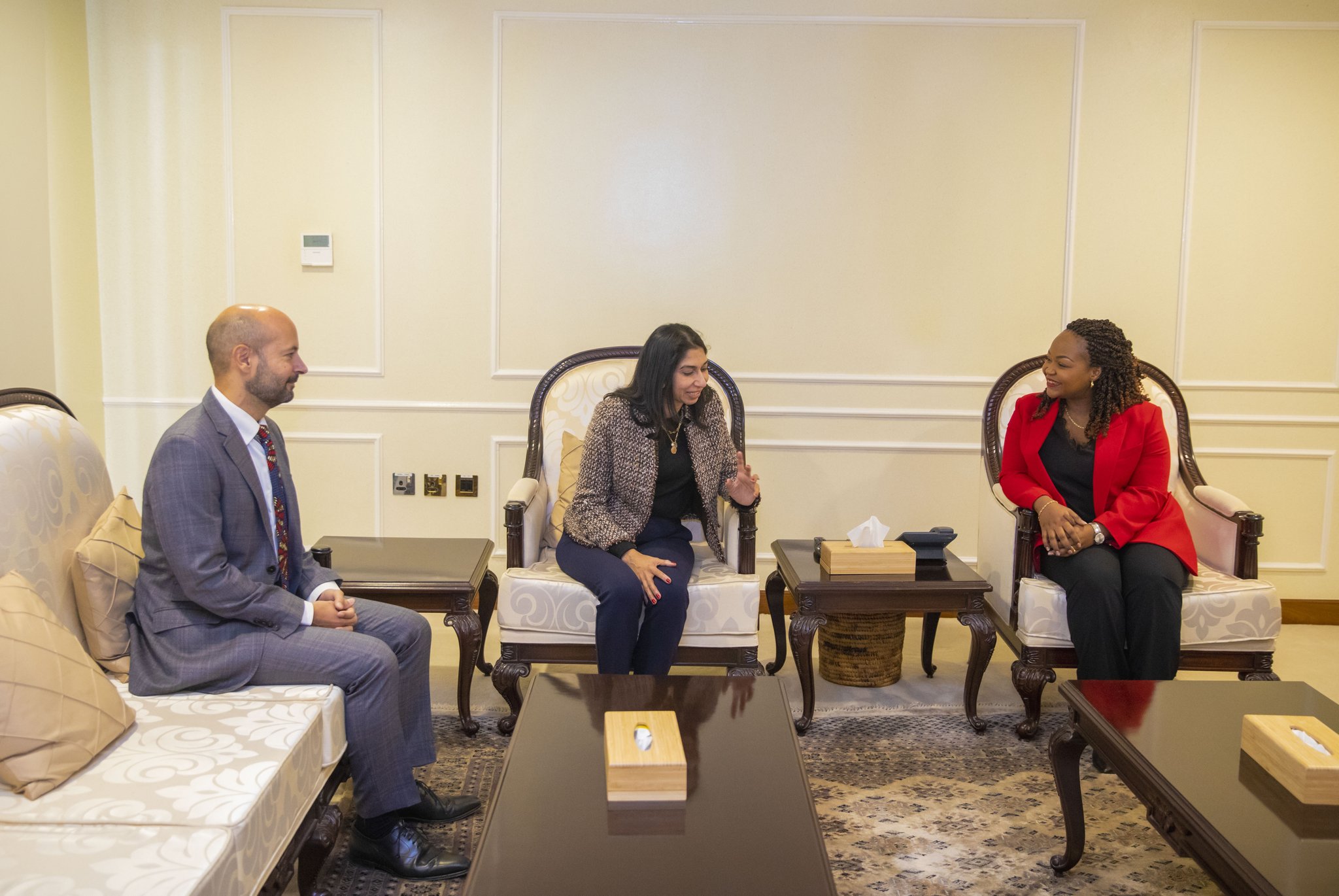 Minisitiri Suella Braverman akigera ku kibuga cy’indege i Kigali, yakiriwe n’Umunyamabanga Uhoraho muri Minisiteri y’Ububanyi n’Amahanga, Mukeka Clementine, ari kumwe na Ambasaderi w’u Bwongereza mu Rwanda, Omar Daair.