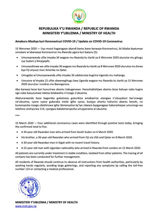 Amakuru mashya atanzwe na Minisiteri y’Ubuzima aravuga ko mu Rwanda kuri iki Cyumweru tariki 15 Werurwe 2020, hagaragaye abandi bantu bane barwaye Coronavirus, ibi bikaba byatumye umubare w’abarwaye Coronavirus mu Rwanda ugera kuri batanu (5).