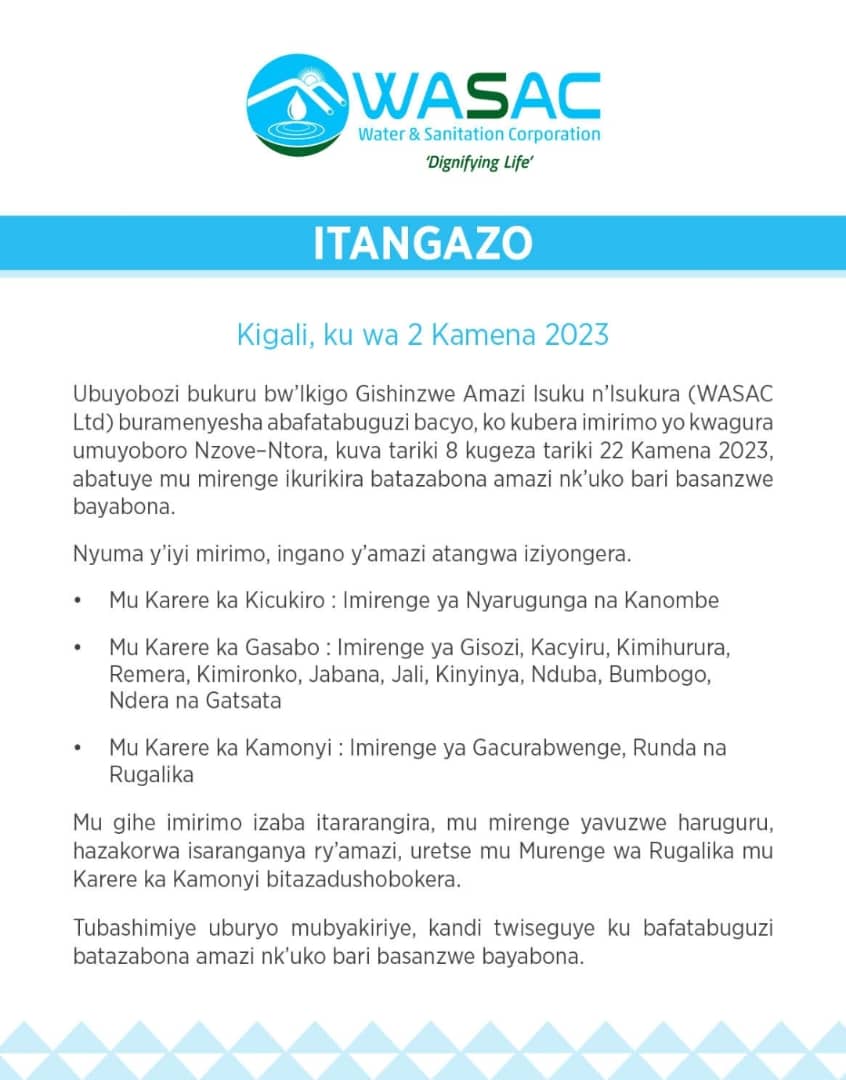 Ikigo gishinzwe Amazi, Isuku n’Isukura(WASAC Ltd) cyatangaje ko hari ibice by’Umujyi wa Kigali na Kamonyi bitazabona amazi nk’uko bisanzwe, bitewe n’imirimo yo gusana umuyoboro wa Nzove - Ntora kuva tariki 8 kugeza tariki 22 Kamena 2023.