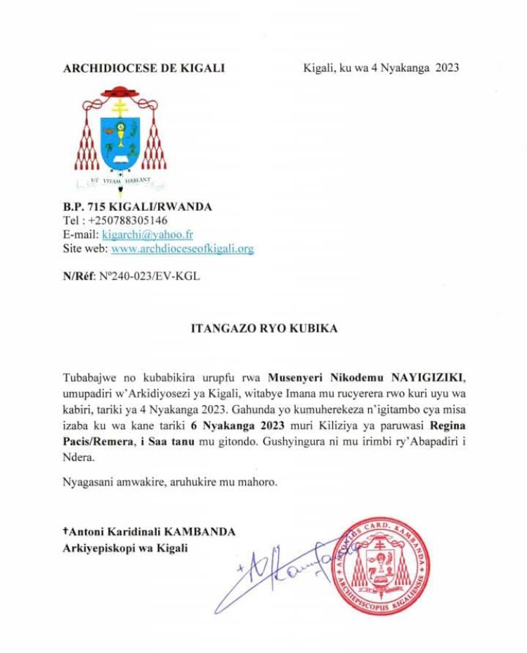 Amakuru yatangajwe na Arikidiyosezi ya Kigali avuga ko Musenyeri Nicodème Nayigiziki, yitabye Imana afite imyaka 94 y’amavuko. Gahunda yo kumuherekeza n’igitambo cya Misa izaba ku wa Kane tariki ya 6 Nyakanga 2023, muri Kiliziya ya Paruwasi Regina Pacis i Remerasaa saa tanu (11h00).