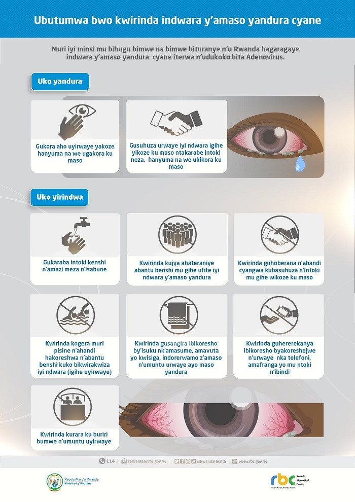 Umukozi wa Minisiteri y’Ubuzima ushinzwe Itangazamakuru, Julien Mahoro Niyingabira, arasaba abanyarwanda ko mu gihe amaso yabo atangiye kuryaryatwa, kuzana amarira no kubyimba bakwiye kwihutira kugana ivuriro ribegereye ariko bakanirinda kujya mu ruhame rw’abantu benshi kugira ngo batabanduza amaso yandura cyane.