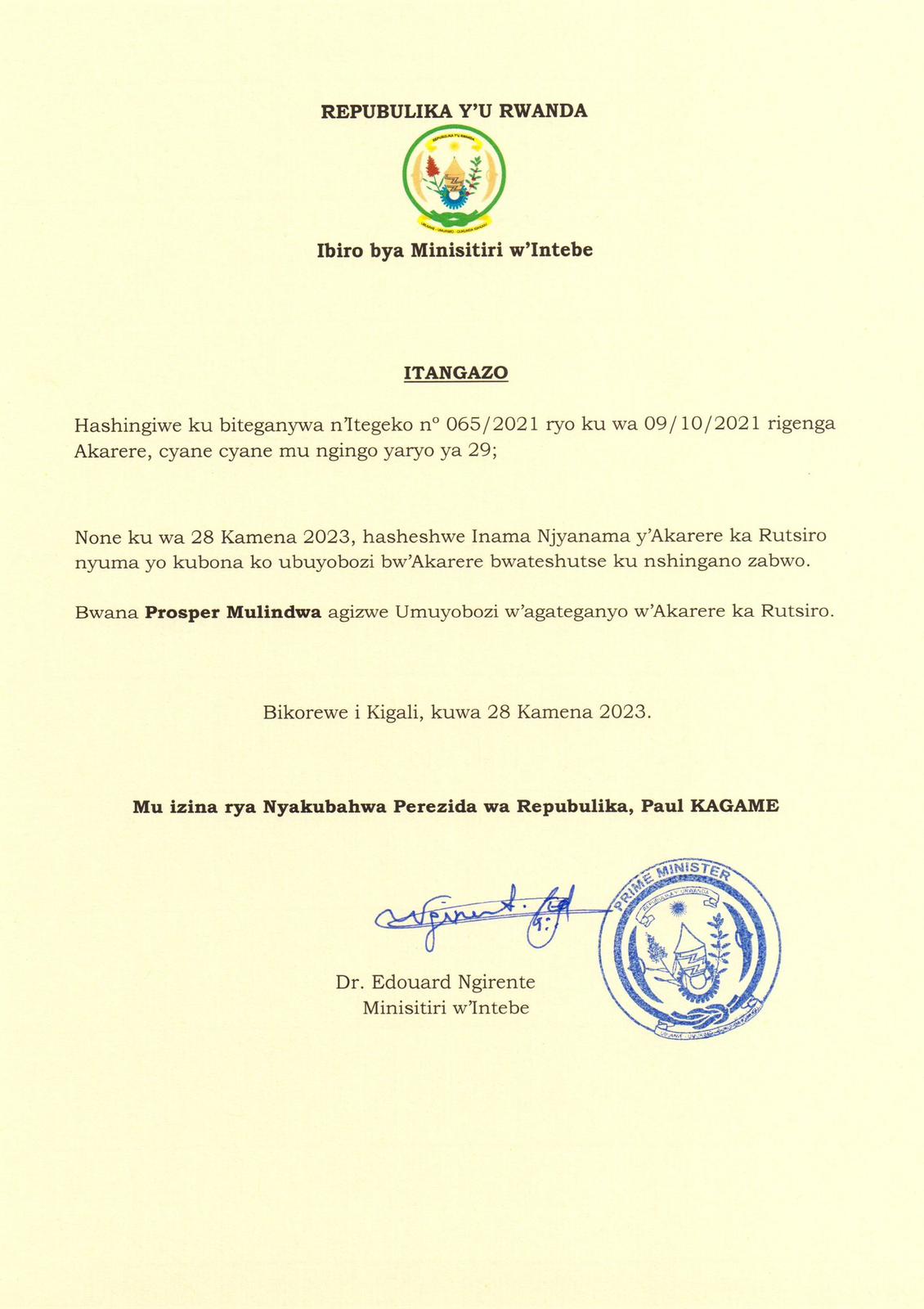 Iryo tangazo rikomeza rivuga ko hashingiwe ku biteganywa n’Itegeko nomero 065/2021 ryo ku wa 09/10/2021 rigenga Akarere cyane cyane mu ngingo yaryo ya 29, Inama Njyanama y’akarere ka Rutsiro isheshwe, hakaba hashyizweho Bwana Mulindwa Prosper, nk’Umuyobozi w’Akarere by’agateganyo.
