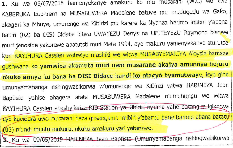 Mu rubanza rwaburanishijwe n’Urukiko rw’Ibanze rwa Busasamana mu Karere ka Nyanza, tariki ya 09 Gicurasi 2019, Umunyamabanga Nshingwabikorwa w’Umurenge wa Kibirizi, Jean Baptiste Habineza, yahamagajwe n’urukiko nk’umutangabuhamya wari uhari, kandi akaba ari na we wari uhagarariye igikorwa cyo gushakisha iyo mibiri.