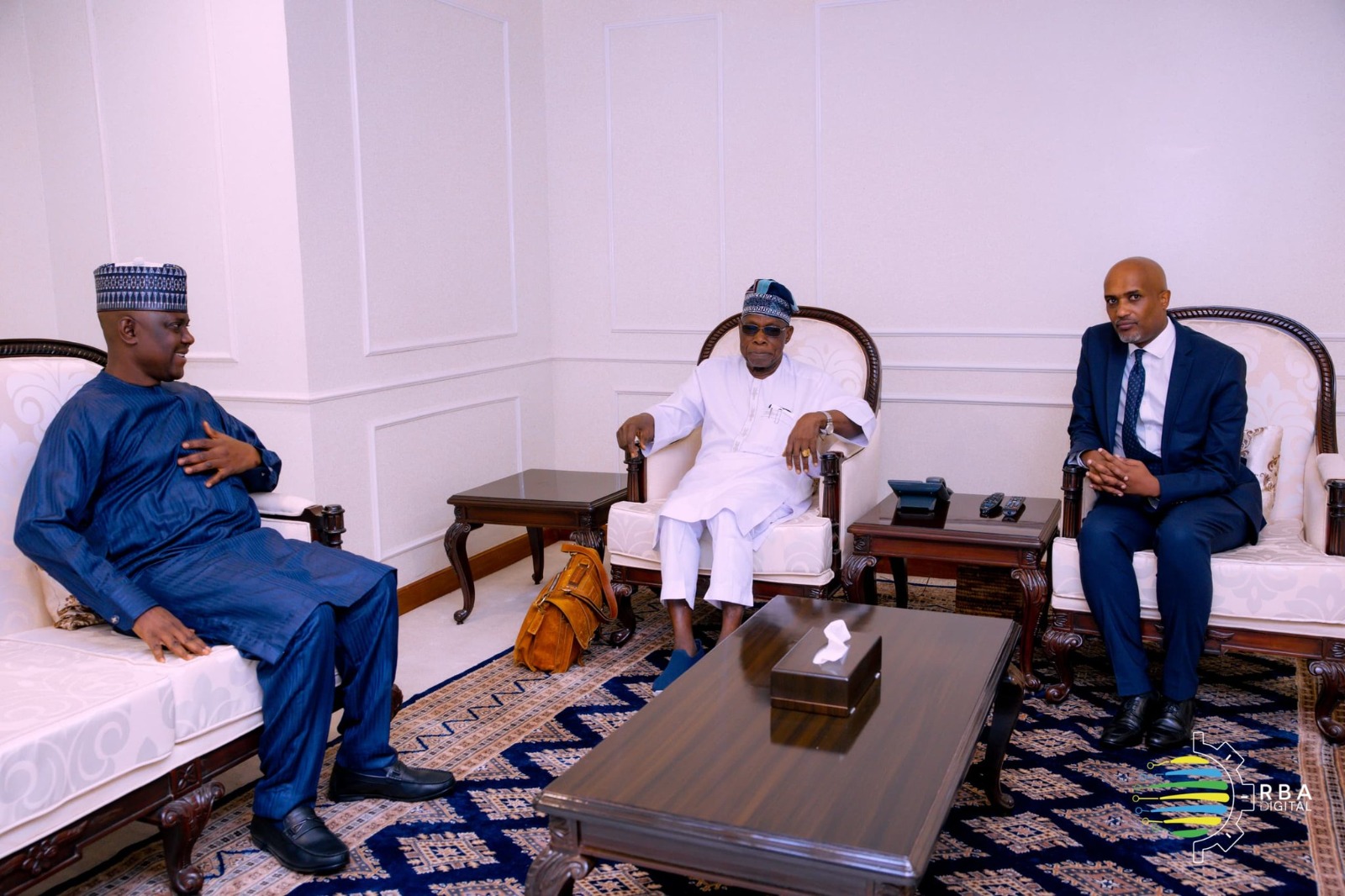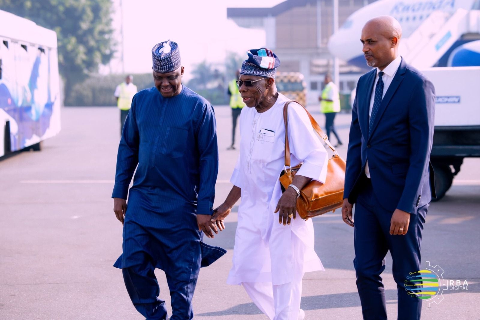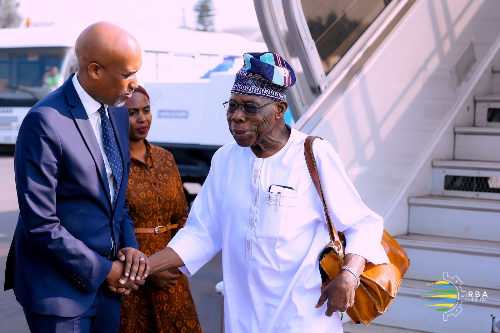 Olusegun Obasanjo wabaye Perezida wa Nigeria ubwo yari ageze i Kigali mu birori by’Irahira rya Perezida Paul Kagame, yakiriwe na Minisitiri w’Ubutabera, Dr Ugirashebuja Emmanuel.
