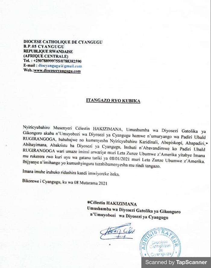 Musenyeri Hakizimana Célestin, Umushumba wa Diyoseze ya Gikongoro akaba n’umuyobozi wa Diyoseze ya Cyangugu Padiri Ubald yabarizwagamo, yemereye Kigali Today iby’urupfu rwe, avuga ko yaguye muri Leta zunze ubumwe za Amerika azize uburwayi bw’ibihaha yasigiwe na Covid-19.