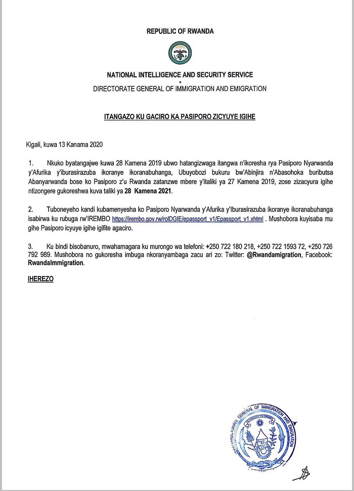 Urwego rw’Abinjira n’Abasohoka mu Rwanda rwatangaje ko Pasiporo z’u Rwanda zatanzwe mbere y’itariki ya 27 Kamena 2019 zose zizacyura igihe ntizongere gukoreshwa kuva tariki ya 28 Kamena 2021.