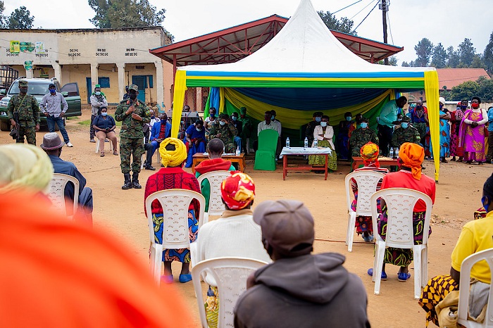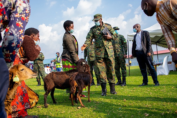 Abayobozi ba RDF bayobowe na Maj Gen Eric Murokore, uhagarariye ‘Reserve force’ mu Ntara y’Amajyaruguru, bari kumwe n’abayobozi mu nzego z’ibanze harimo Umuyobozi w’Akarere ka Rutsiro, Ayinkamiye Emerence na Nzabonimpa Deogratias, Umuyobozi w’Akarere ka Rubavu wungirije ushinzwe iterambere ry’ubukungu, bashyikirije iyo mpano imiryango yatoranyijwe.