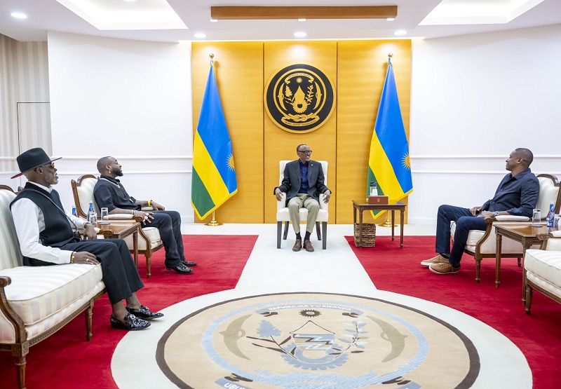 Umuhanzi Davido, yakiriwe na Perezida Kagame aherekejwe n’abarimo Masai Ujiri, washinze umuryango wa Giants of Africa, ndetse akaba asanzwe ari Perezida w’Ikipe ya Toronto Raptors, yo muri Canada, ikina muri Shampiyona ya Basketball ya Amerika (NBA).
