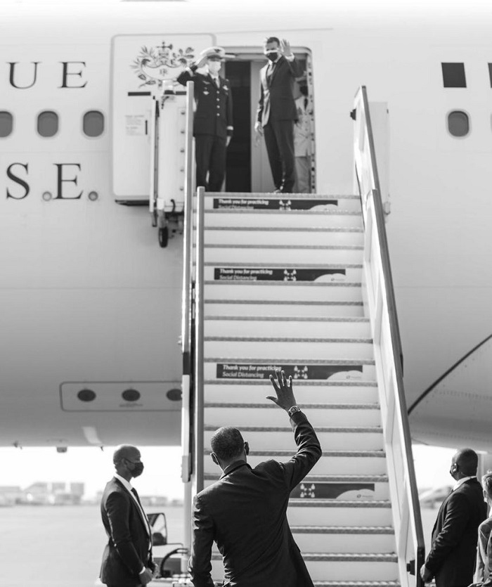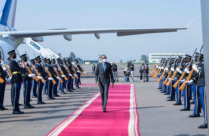 Perezida Kagame yaherekeje Macron ku kibuga mpuzamahanga cy’indege cya Kigali mu gitondo cyo kuri uyu wa Gatanu tariki 28 Gicurasi 2021.
