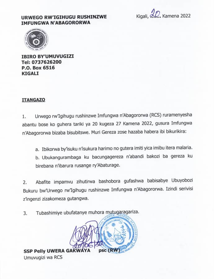 Kuva tariki ya 20 kugera 27 Kamena 2022, ibikorwa byo gusura imfungwa n’abagororwa muri gereza zose zo mu Rwanda byahagaritswe, kubera ko hazaba ibikorwa by’isuku n’isukura harimo gutera imiti yica imibu itera Malaria, nk’uko bigaragara mu itangazo ryashyizwe ahabona.