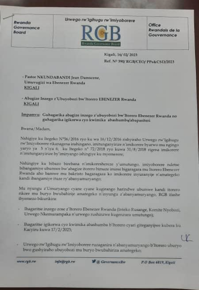Urwego RGB ruvuga ko rushingiye ku Itegeko rirushyiraho ndetse n’Itegeko rigena imikorere n’imitunganyirize by’imiryango ishingiye ku myemerere, rwandikiye Pasiteri Nkundabandi ibaruwa imuhagaharika ku buyobozi bwa Ebenezer Rwanda, ndetse n’inzego zose zigize iryo torero.