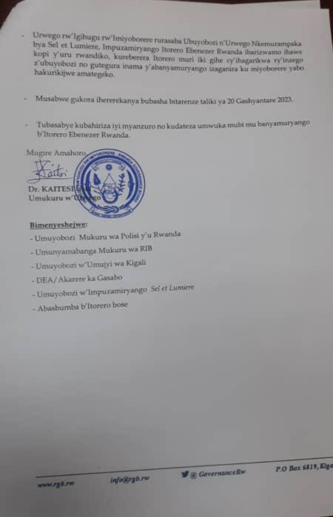 Ibaruwa ikomeza igira iti "RGB ihagaritse inzego zose z’Itorero Ebenezer Rwanda, ihagaritse (kandi) igikorwa cyo kwimika abashumba b’Itorero cyari giteganyijwe kubera ku Kacyiru ku wa 17/2/2023.
