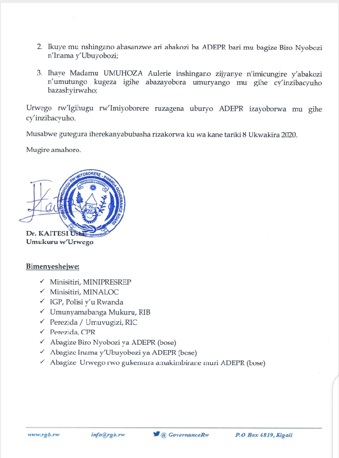 Urwego rw’Igihugu rw’Imiyoborere (RGB) rwatangaje ko rwakuyeho abagize inzego z’ubuyobozi bw’Itorero rya ADEPR guhera kuri uyu wa Gatanu tariki 02 Ukwakira 2020, nk’uko bigaragara muri iyi baruwa.