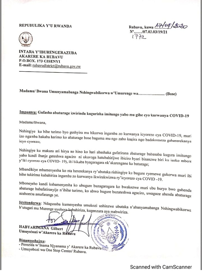 Umuyobozi w’Akarere ka Rubavu Habyarimana Gilbert avuga ko iyo baruwa yanditswe hashingiwe ku makuru yatanzwe n’abaturage , aho hari abashakaga kubagurira imitungo ibanje guteshwa agaciro hatubahirijwe ibiciro byari bisanzwe mbere ya COVID-19, Akarere rero kakavuga ko harimo akarengane.