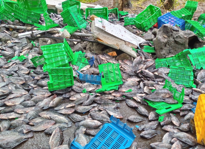 Iyi mpanuka yatumye imodoka yangirika cyane n’amafi bari batwaye, ndetse n’ibisima byo ku muhanda bitangira ibinyabiziga birasenyuka.