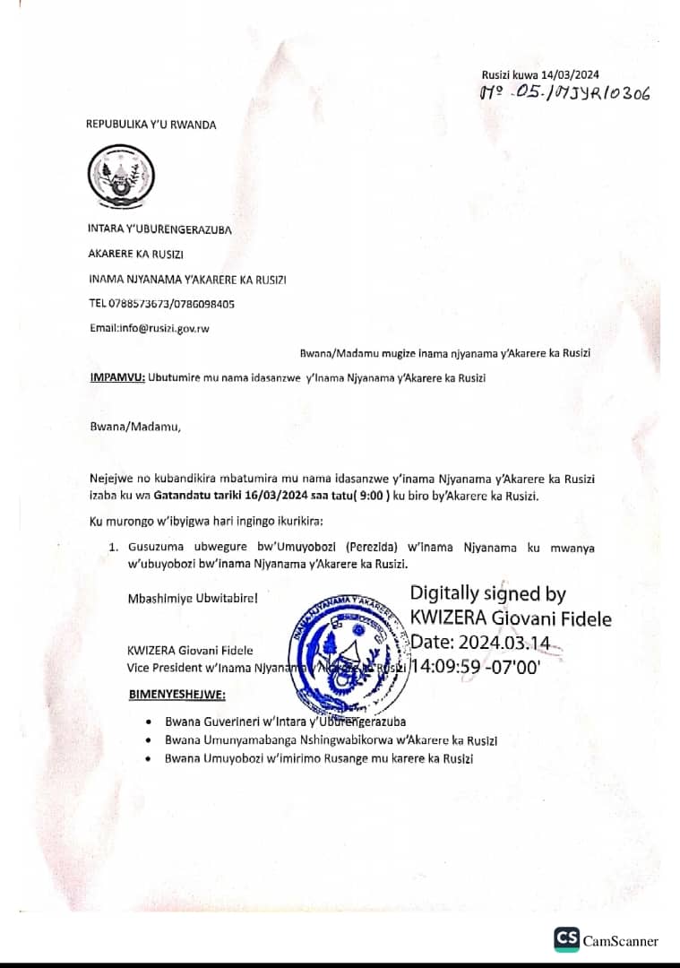 Ibaruwa yanditswe n’umwungirije, Kwizera Giovani Fidèle, atumira inama idasanzwe yo gusuzuma ubwegure bwe igira iti “nejejwe no kubandikira mbatumira mu nama idasanzwe y’Inama Njyanama y’Akarere ka Rusizi, izaba ku wa Gatandatu tariki 16/03/2024 saa satu ku biro by’Akarere ka Rusizi”.