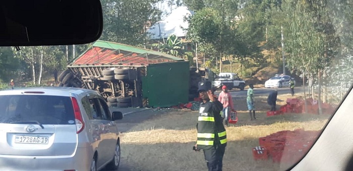 Ati “Iyo mpanuka yabaye mu ma saa kumi n’igice zo mu gitondo, yatewe no kugenda nabi k’umushoferi, ntabwo yari yanyohe ahubwo yari afite umuvuduko. Imodoka yaguye mu muhanda hagati ubu iracyarimo, imodoka nto twazishakiye indi nzira ziba zikoresha, umushoferi ameze neza ntacyo yabaye”.