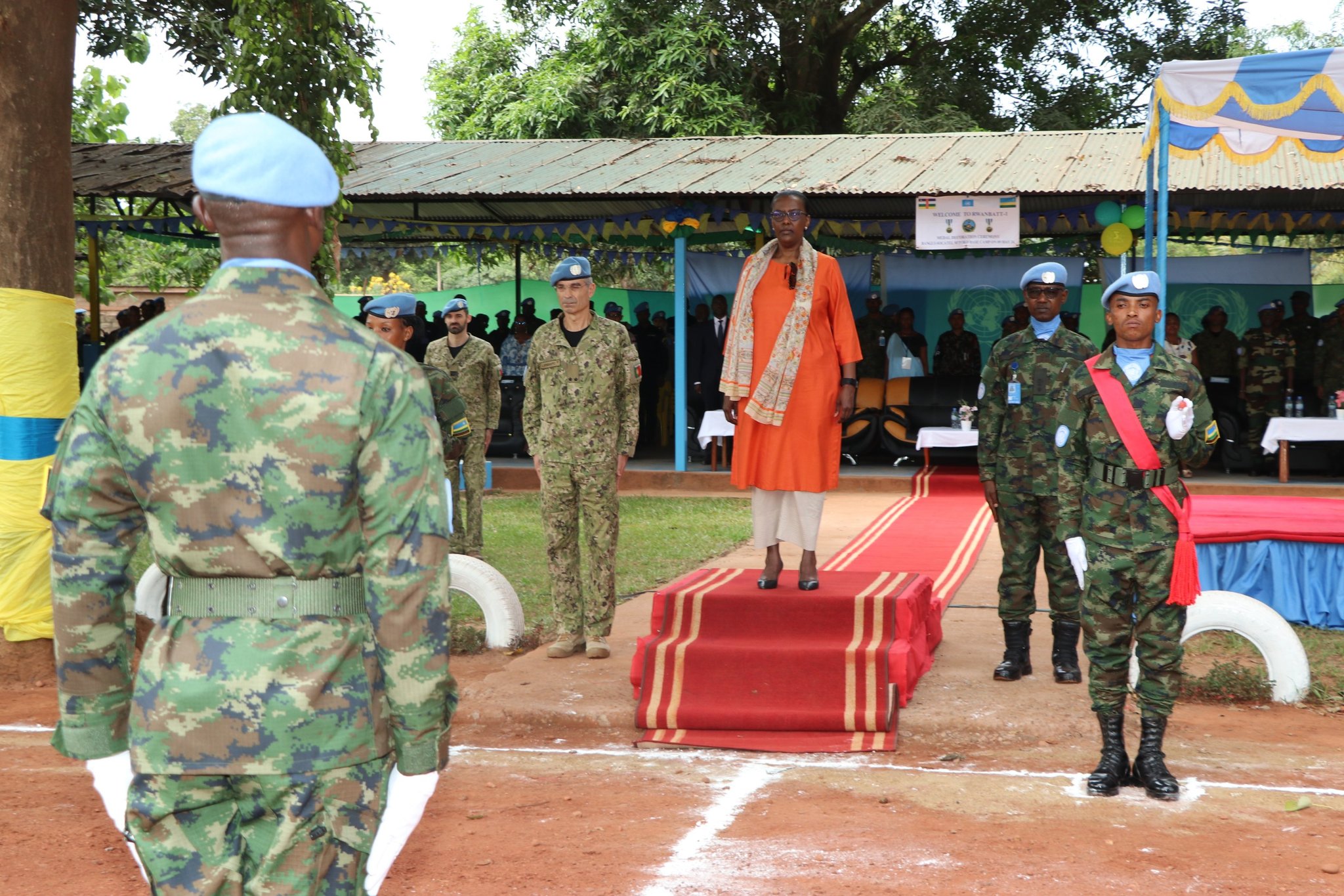 Madamu Valentine RUGWABIZA, intumwa idasanzwe y’umunyamabanga mukuru w’umuryango w’abibumbye akaba n’umuyobozi w’ubutumwa bwa MINUSCA, niwe wayoboye uyu muhango wo kwambika Ingabo z’u Rwanda imidari y’ishimwe.
