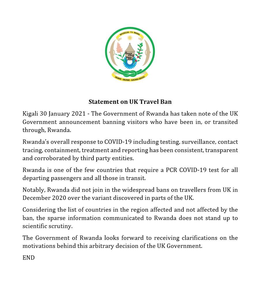 U Rwanda kandi ruravuga ko rutakumiriye abagenzi bava mu Bwongereza nyuma y’uko mu Kuboza 2020 mu bice bimwe by’icyo gihugu hari habonetse ubwoko bushya bwa COVID-19.