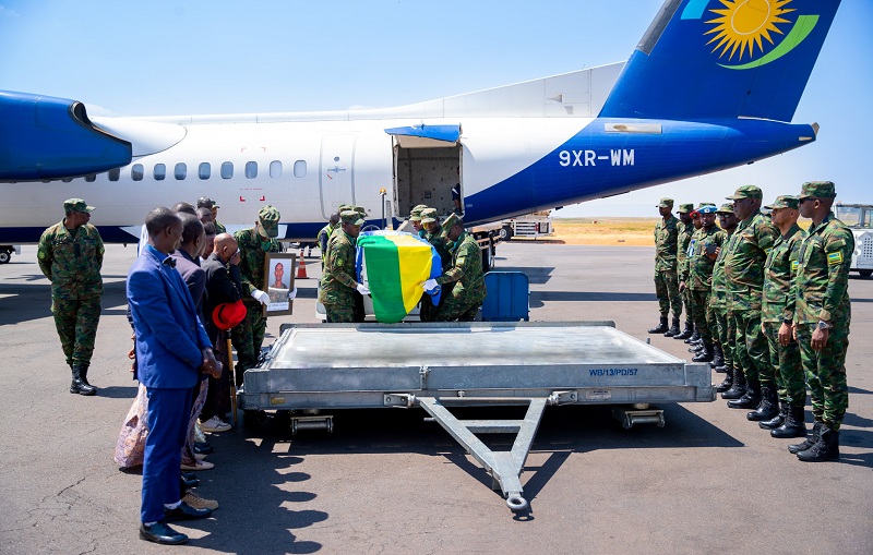Abasirikare ba RDF bayobowe na Maj Gen Ruki Karusisi n’umuryango wa nyakwigendera, ni bo bakiriye mu cyubahiro umubiri w’uwo musirikare, ku kibuga cy’indege cya Kigali.