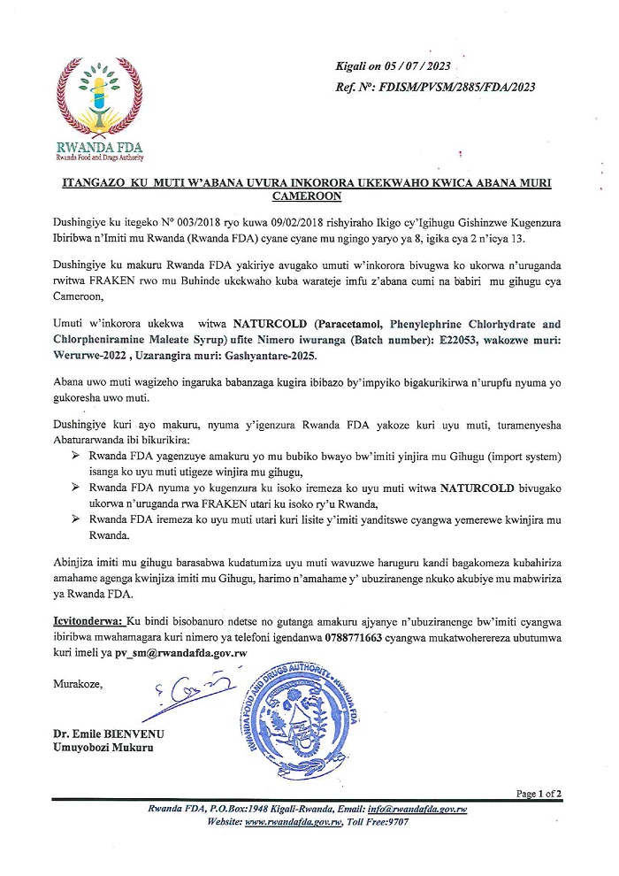 Itangazo rikomeza rivuga ko abana 12 uwo muti ukekwaho guhitana nyuma yo kuwukoresha babanzaga kugira ibibazo by’impyiko nyuma bigakurikirwa n’urupfu.