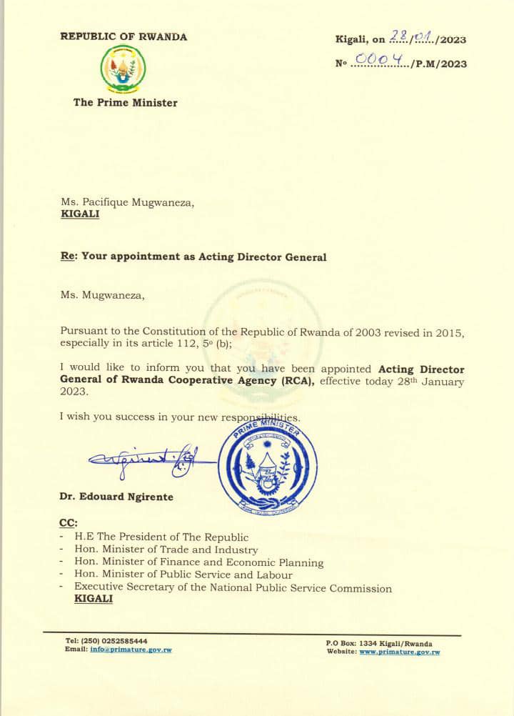 Indi baruwa nanone yavuye mu biro bya Minisitiri w’Intebe, ivuga ko Pacifique Mugwaneza agizwe umuyobozi w’agateganyo wa RCA.