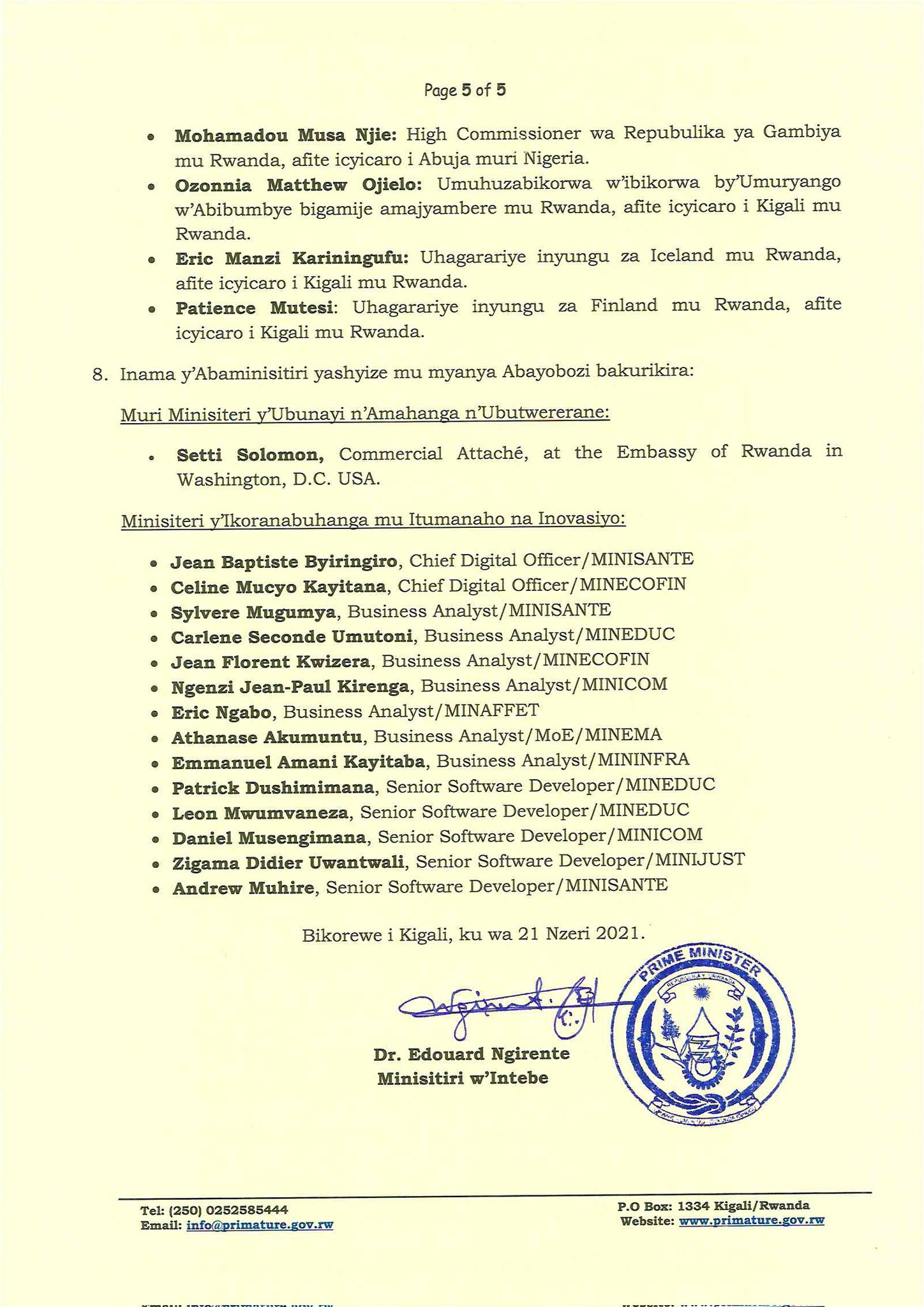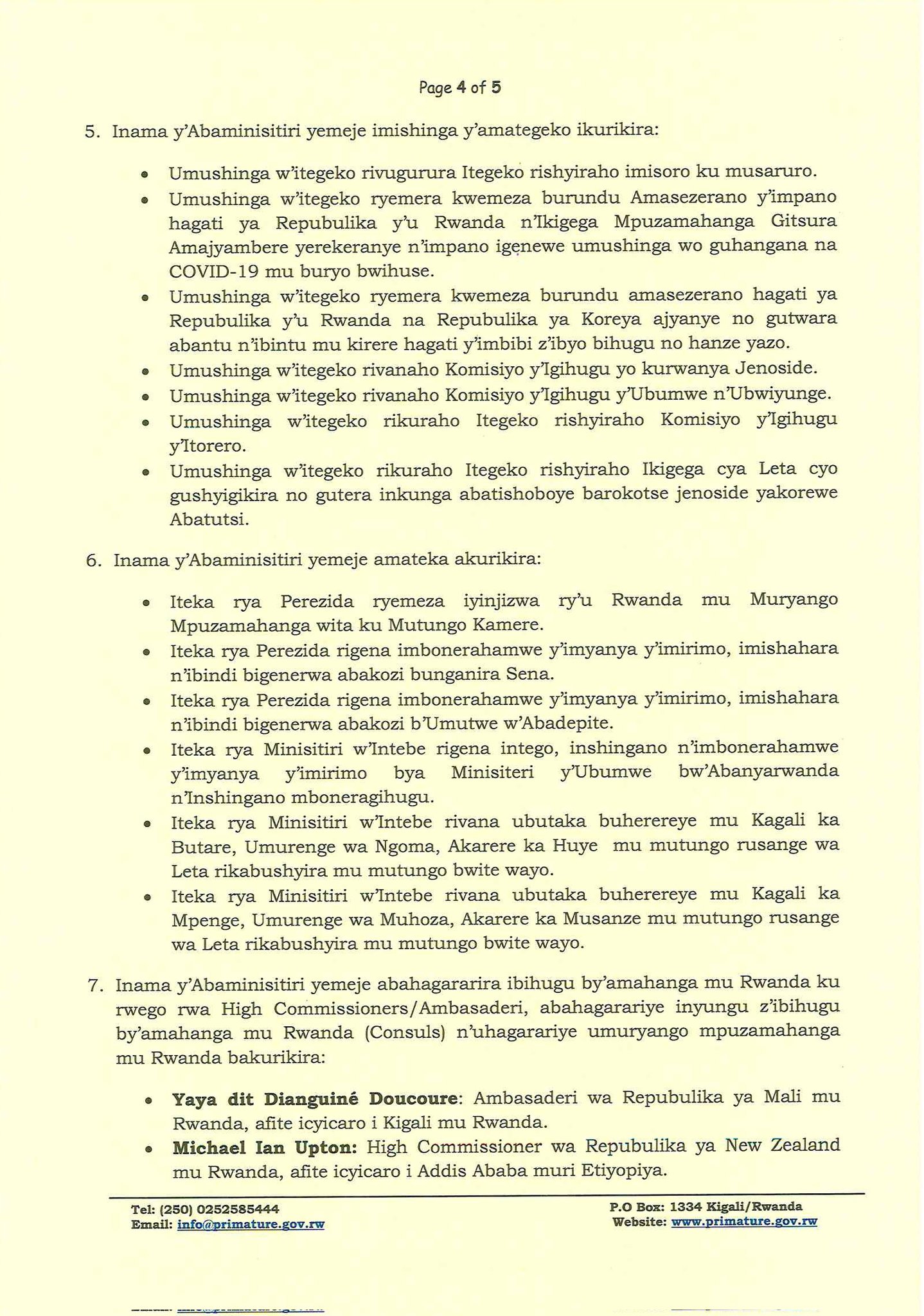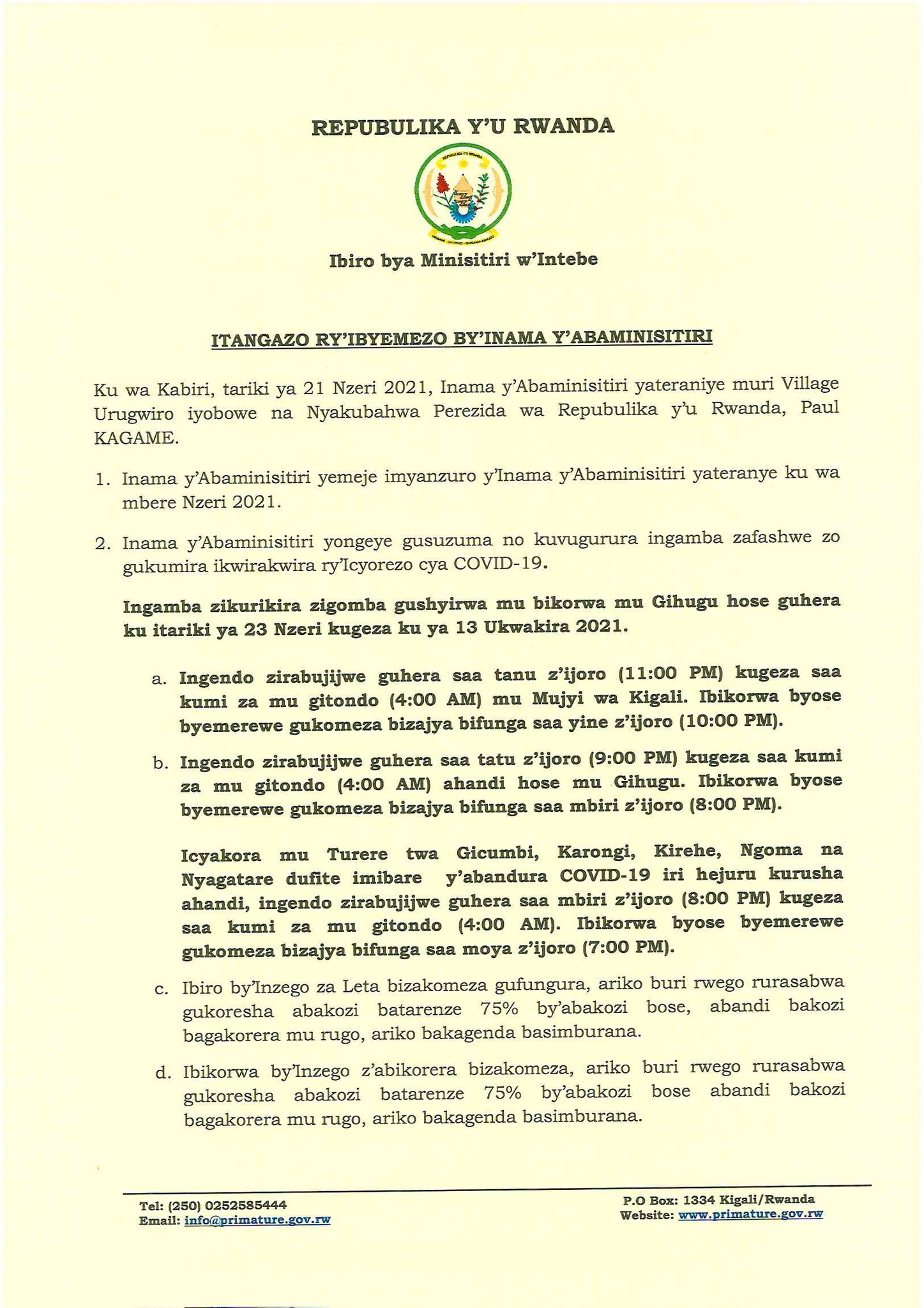 Perezida wa Repubulika y’u Rwanda Paul Kagame, kuri uyu wa Kabiri tariki 21 Nzeri 2021 yayoboye Inama y’Abaminisitiri yabereye muri Village Urugwiro, ifatirwamo imyanzuro ikurikira: