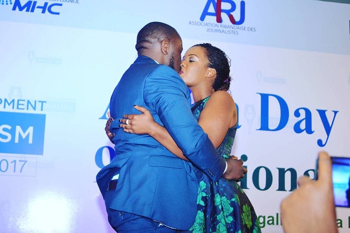 2. Umunyamakuru Eugene Anangwe wateye ivi imbere y’abanyamakuru mu muhango wo kwizihiza Umunsi Nyafurika w’Itangazamakuru tariki 04 Kamena 2017.